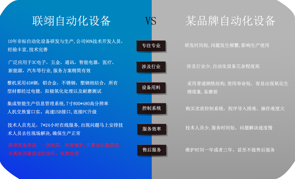 聯(lián)翊專注于助力企業(yè)邁向自動(dòng)化,減少人工成本,增加生產(chǎn)能力,提升行業(yè)競(jìng)爭(zhēng)優(yōu)勢(shì),從方案→設(shè)備→售后,一站式設(shè)備服務(wù)提供商,選擇聯(lián)翊,終身無憂。